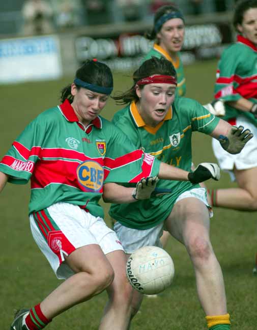 Christina Heffernan battling it out against Meath in the Ladies NFL quarter-final at Ballinrobe on Sunday 30th March. Photo Michael Donnelly.